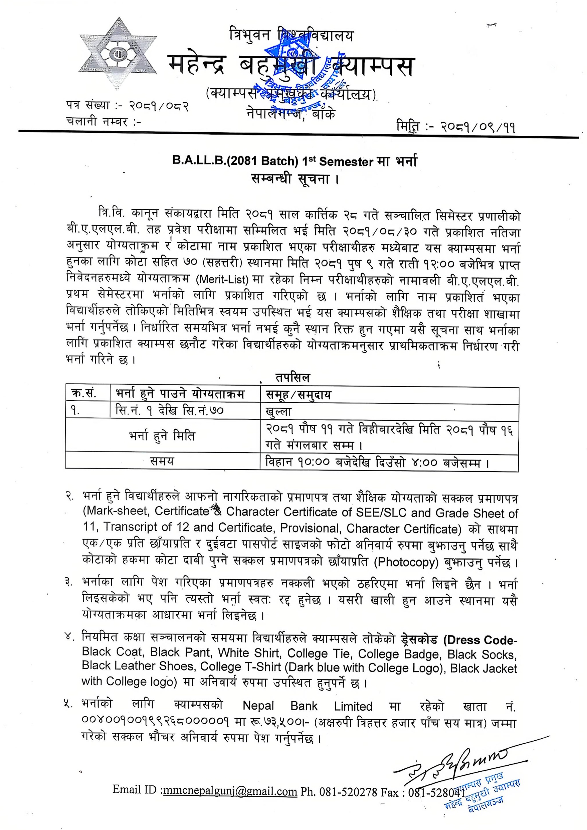 B.A.LL.B.(2081 Batch) 1st Semester मा भर्ना सम्बन्धी सूचना !