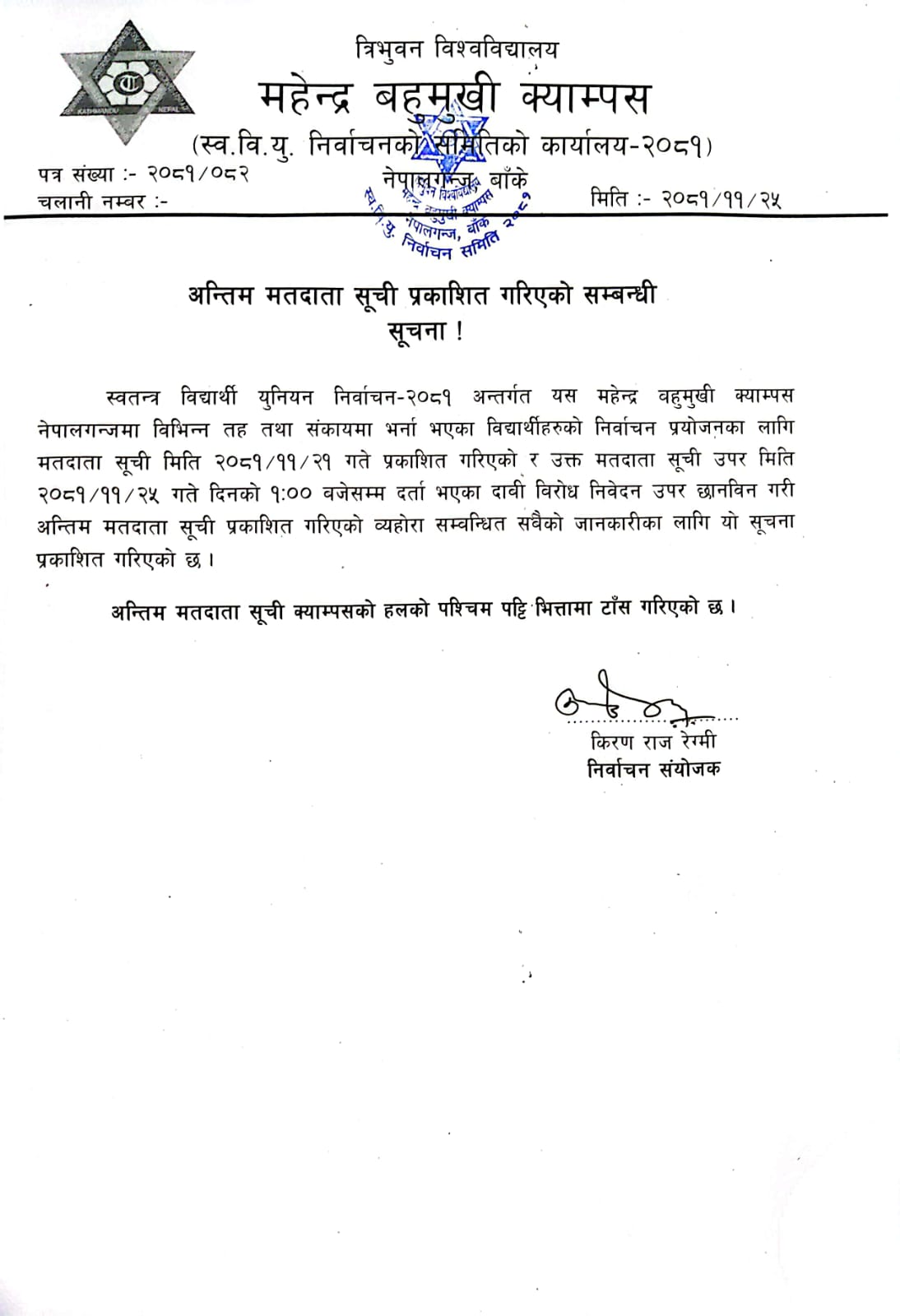 स्वतन्त्र विद्यार्थी युनियन निर्वाचन - २०८१ प्रयाेजनका लागि अन्तिम मतदाता सूची प्रकाशित गरिएकाे सम्बन्धी सूचना